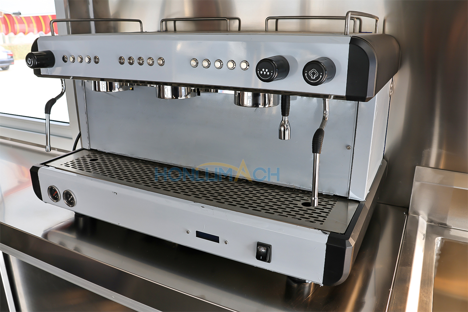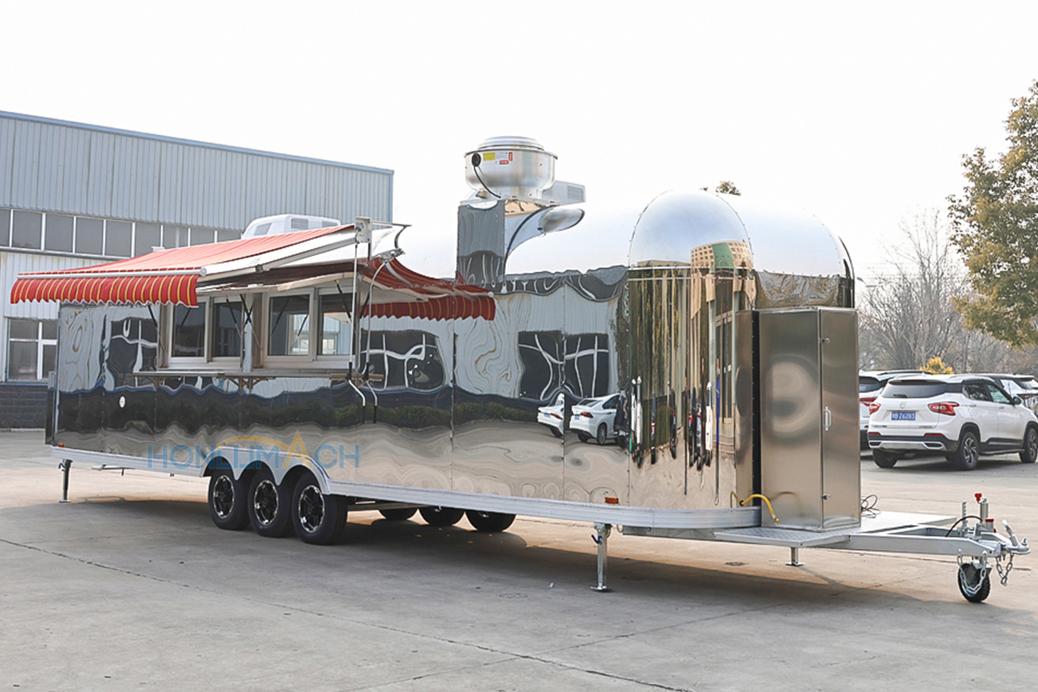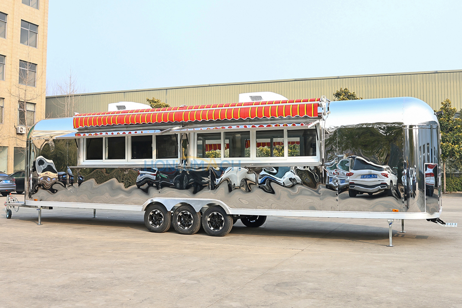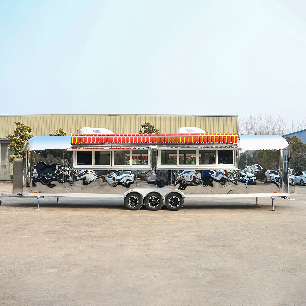This is a 32ft stainless steel mobile catering trailer we have customized for a customer from Australia. We manufacture it according to the customer’s requirements. As we can see from the pictures, it has big service windows in the front, which is very convenient for customers to order and pick up their meals.