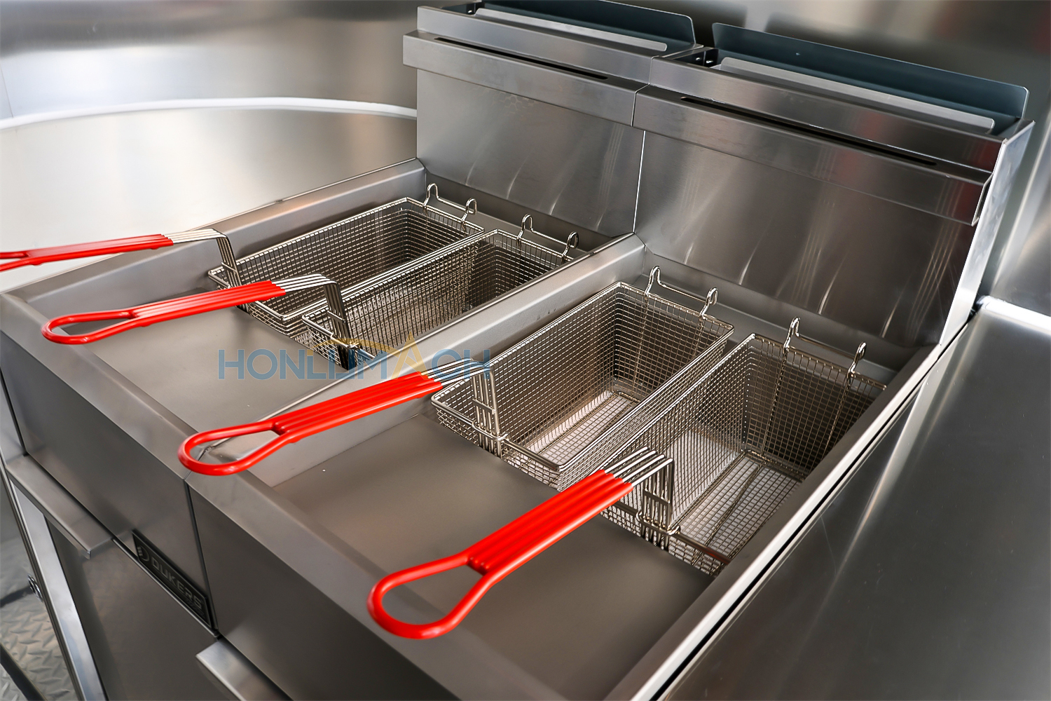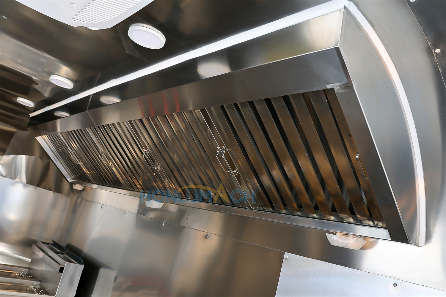 According to the customer’s requirements, we have equipped the 32ft stainless steel commercial kitchen with kitchen equipment. The following are some of the inner details of this trailer. There is a range hood, a gas griddle, a gas fryer, sinks, a salad bar refrigerator, an electric crepe maker, a monitor, a food display cabinet, etc.