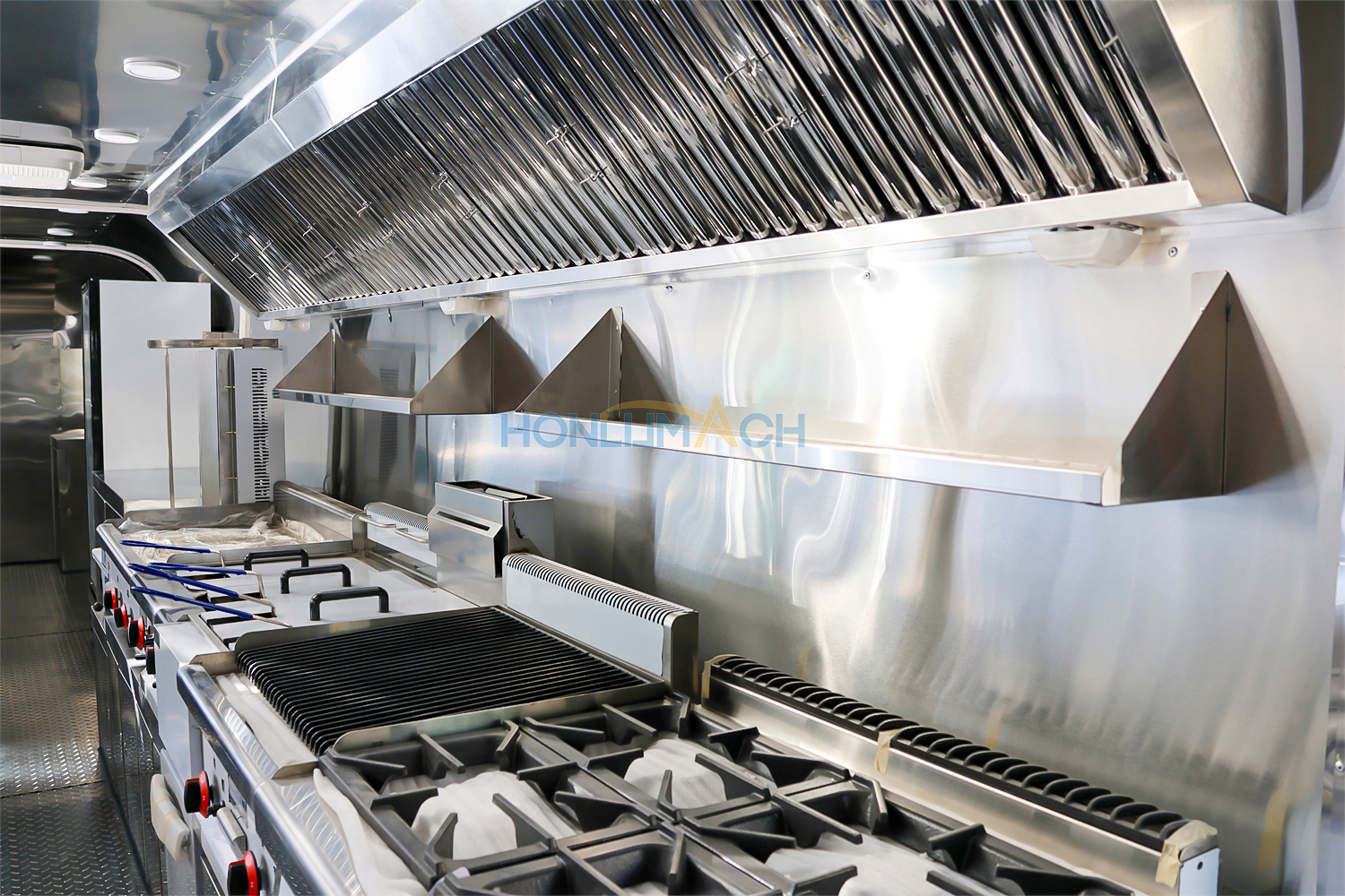 According to the customer’s requirements, we have equipped the 32ft stainless steel commercial kitchen with kitchen equipment. The following are some of the inner details of this trailer. There is a range hood, a gas griddle, a gas fryer, sinks, a salad bar refrigerator, an electric crepe maker, a monitor, a food display cabinet, etc.
