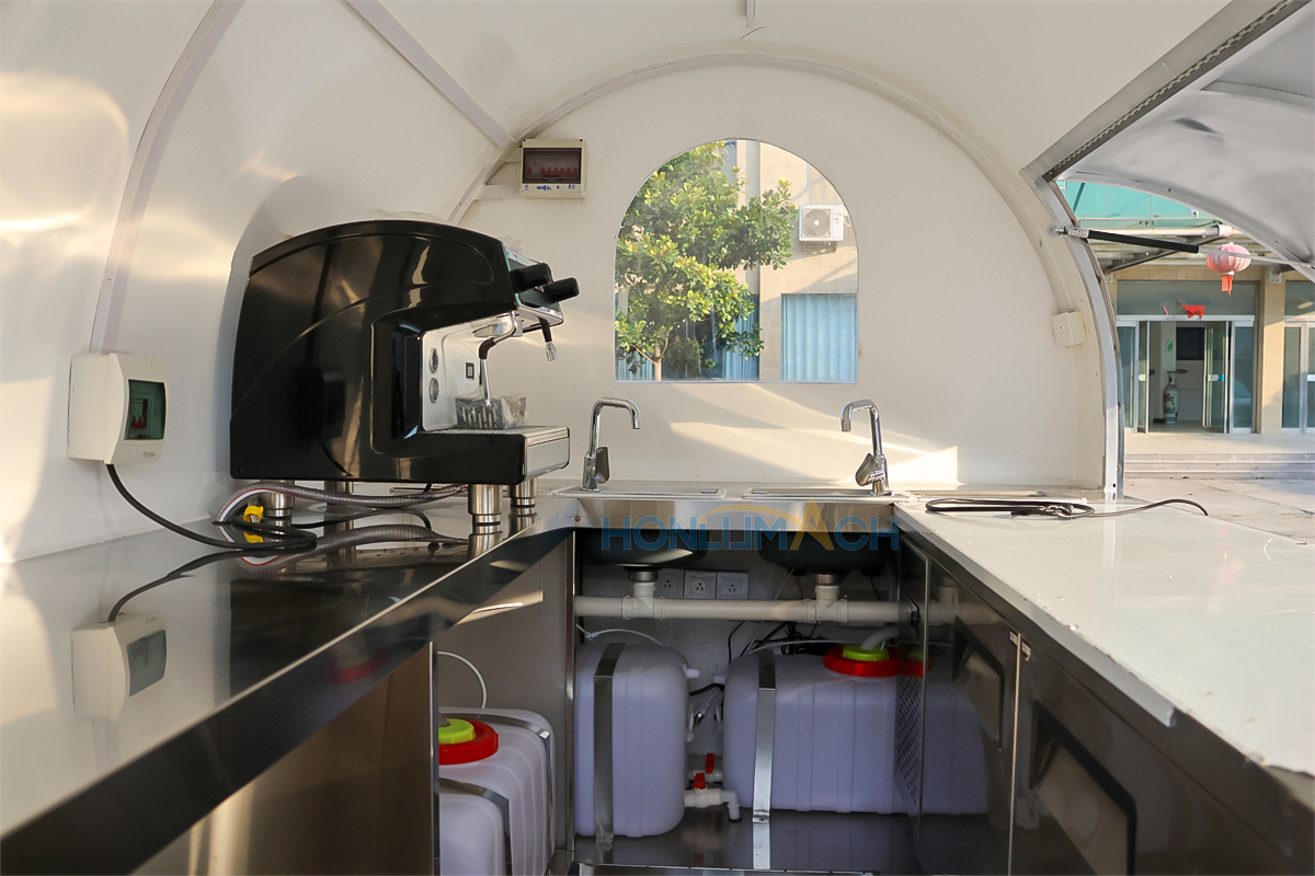 This is a 9.8ft coffee food truck we have customized for a customer from Austrian. We manufacture it according to the customer’s requirements. As we can see from the picture below, it has a big service window in the front, which is very convenient for people to order and pick up their meals. Besides the window, with its white color, this food truck is very appealing to the crowd. Next, let’s see the display video of this food truck.