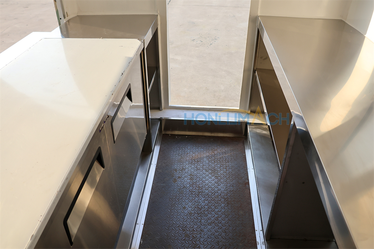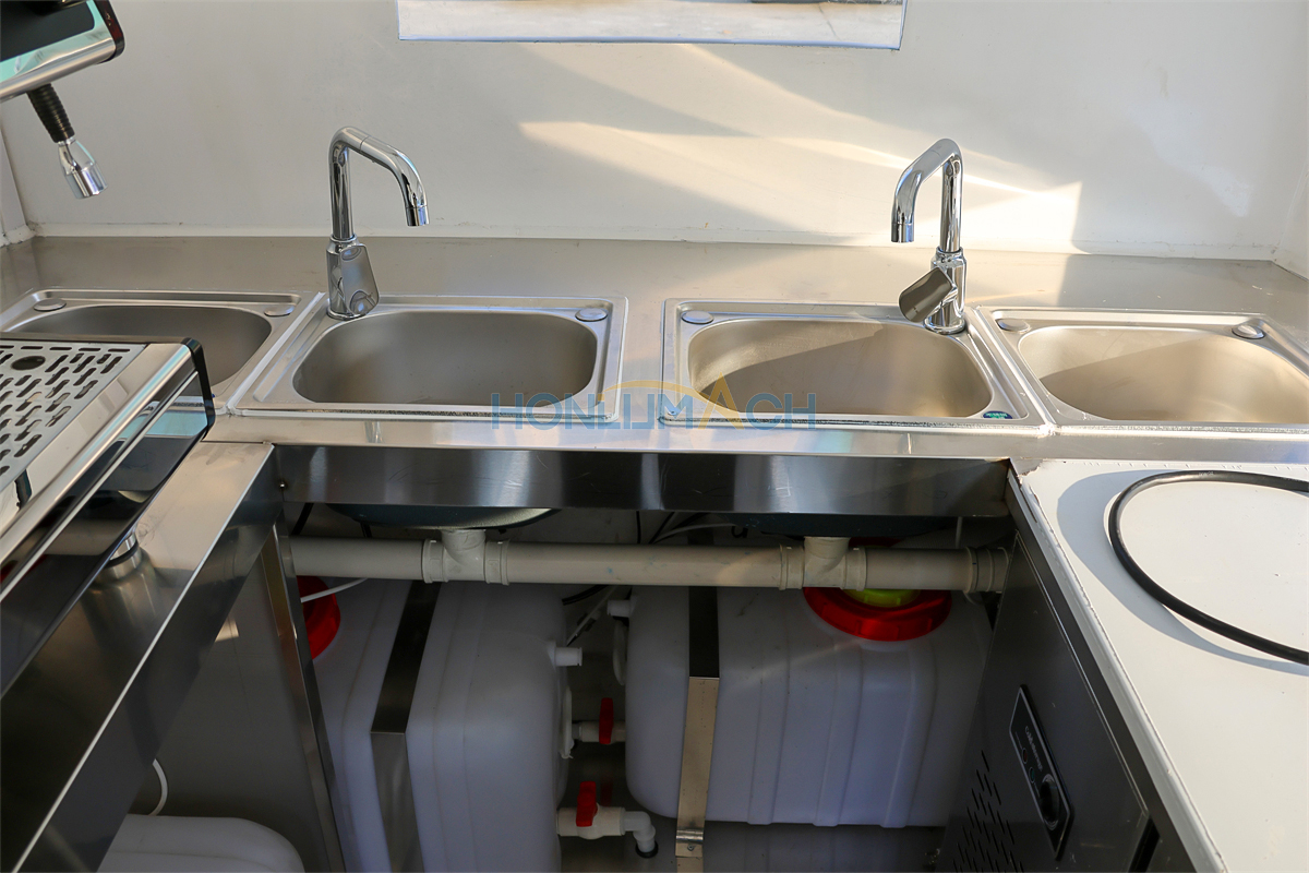 According to the customer’s requirements, we have equipped the 3m galvanized food truck with kitchen equipment. In the following are some of the inner details of this food truck. There are sinks, an air conditioner, and a work table, etc.