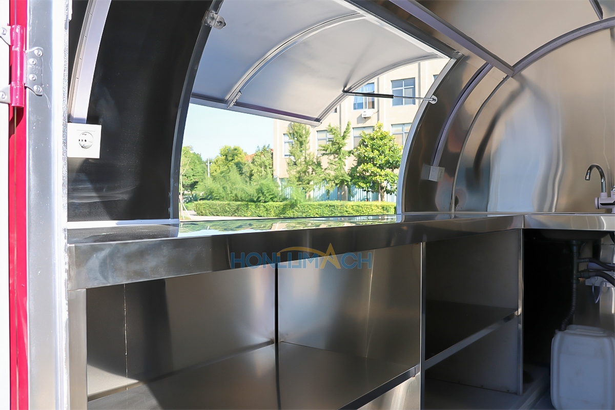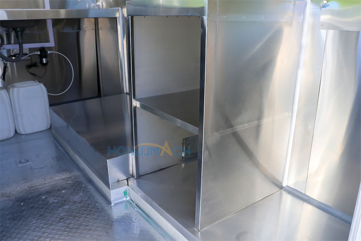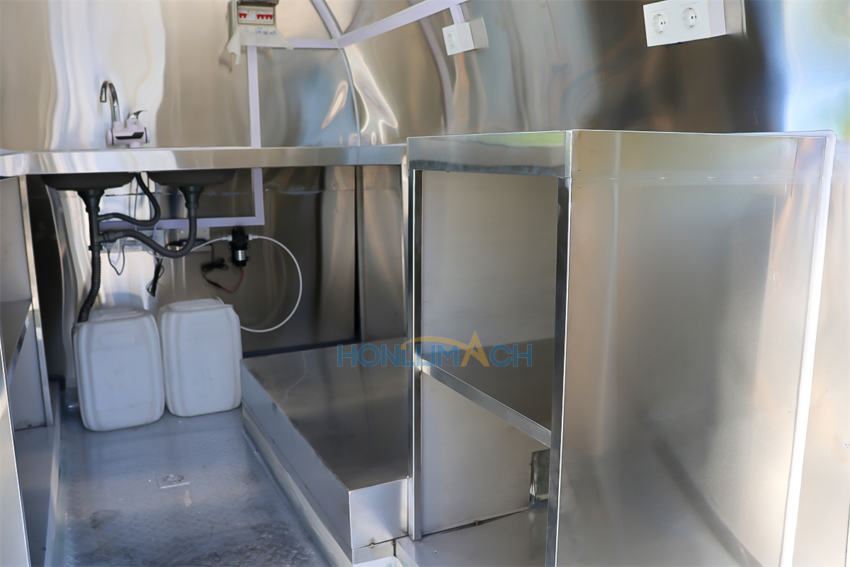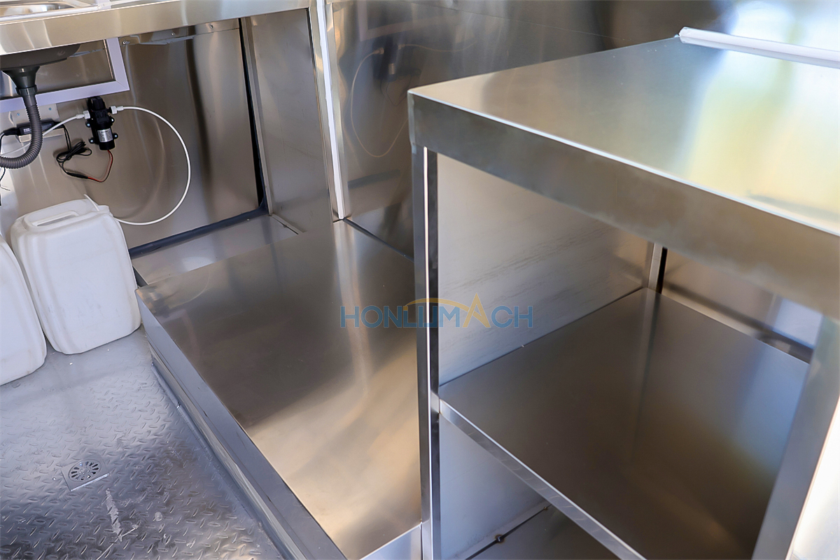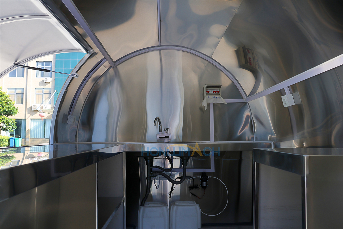 | Standard Configuration | 1) 201 Stainless steel interior wall, 2) 201 stainless steel workbench, 3) 304 Stainless steel sinks *2 4) hot & cold tap *1 5) 20L water basket *2 6) tire*4 7) jack*4 8) big service window * 1 9) socket*6 10) power switch More, customized |