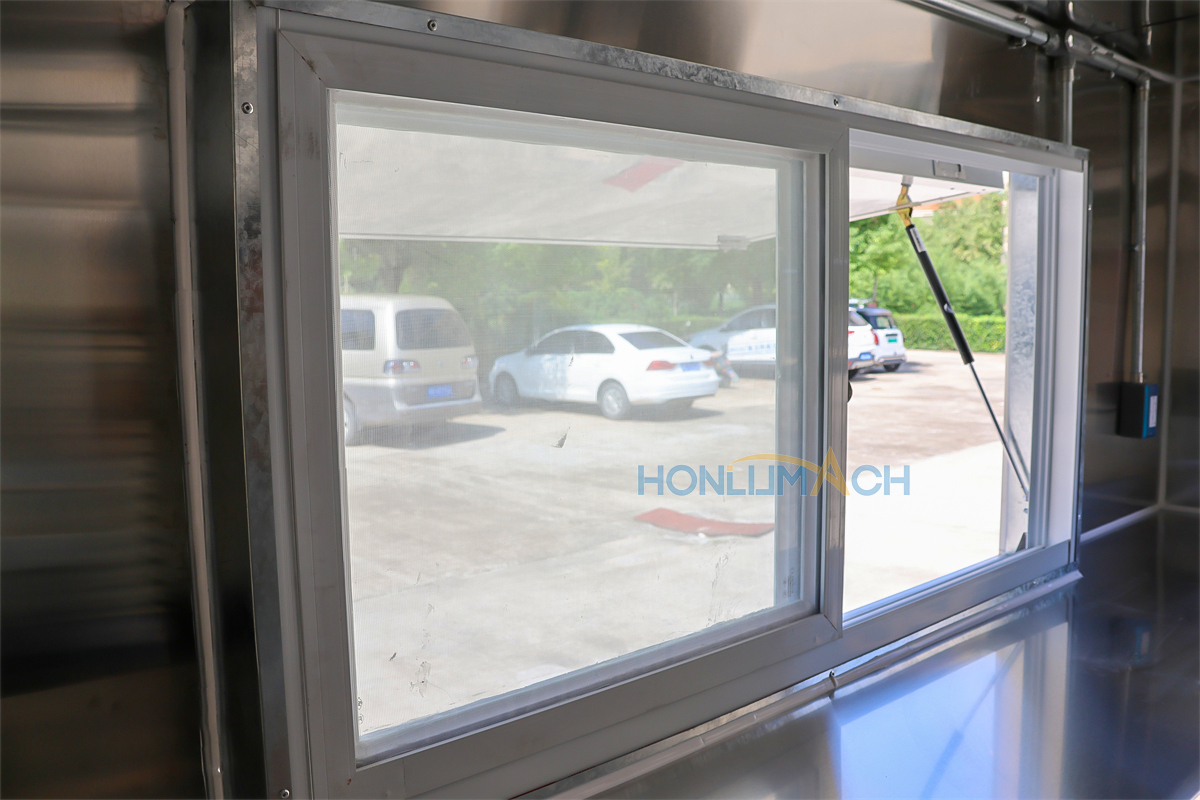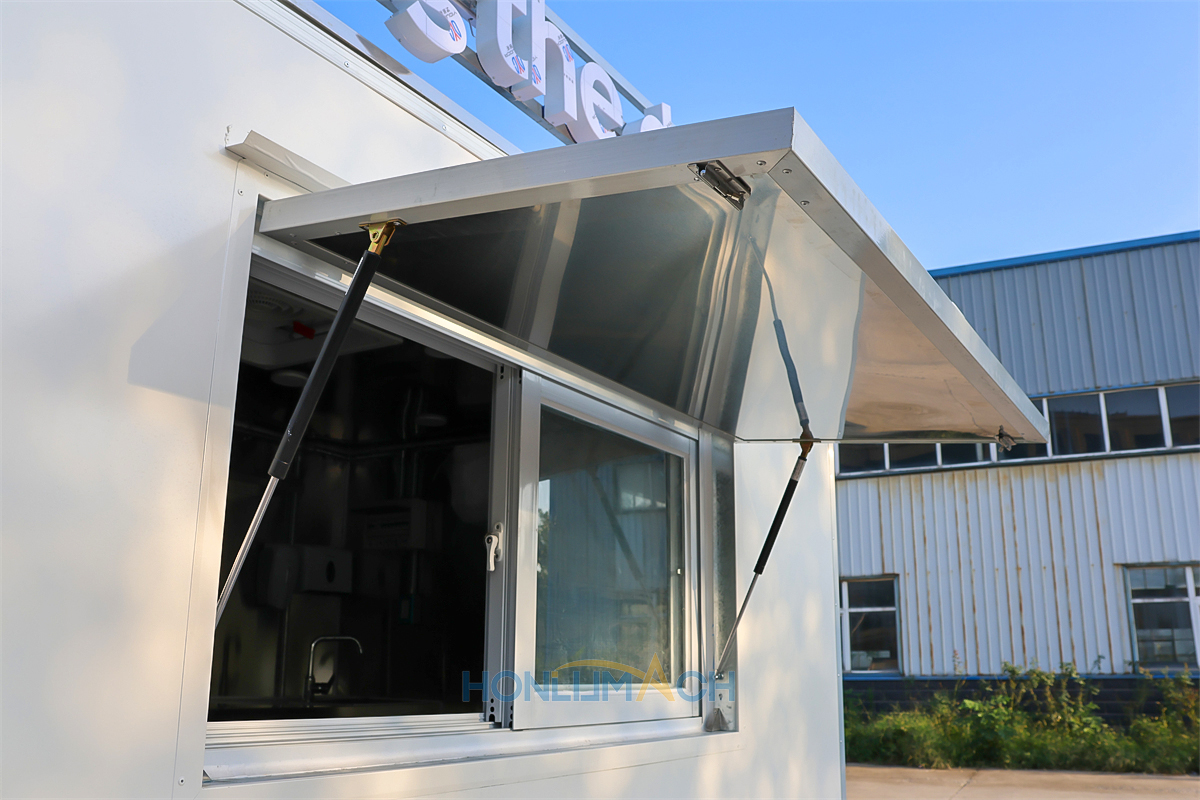 In front of the food trailer, we have made big servie windows according to the customer’s requirements. That will be very convenient for guests who come to dine to order and pick up their meals. On the top of each window, we have installed a retractable awning. The awning will protect people from sunshine and rain, which is a thoughtful design. Next, let’s see the back view of this large food trailer.