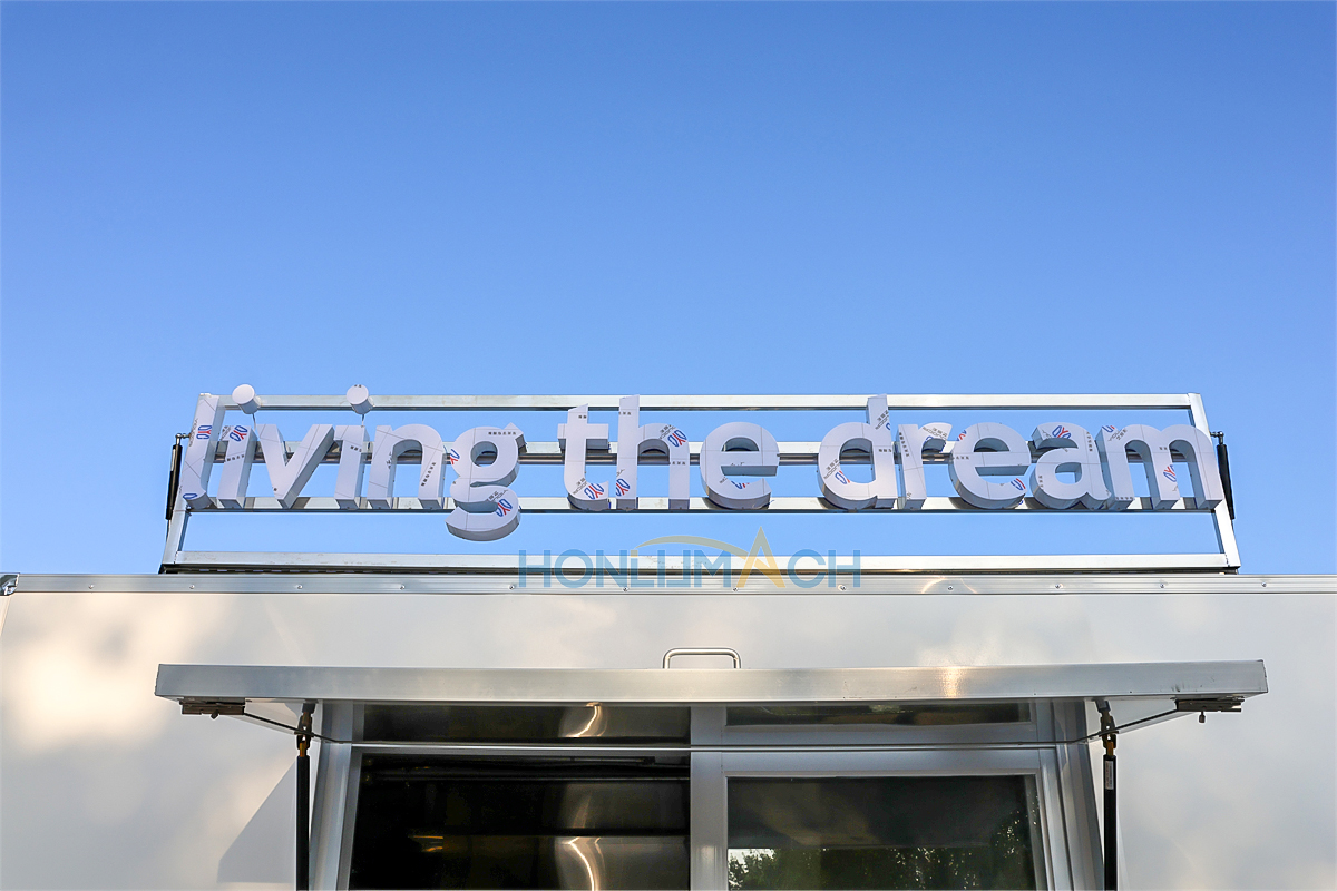 This is a food truck from Croatia, approximately 9.8 feet long. The entire vehicle’s appearance, color, pattern, and structure were customized to the client’s specifications. A large, custom-designed illuminated sign on the roof ensures it is clearly visible even on the darkest nights, making it easy for customers to find.