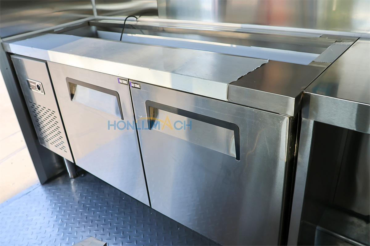 According to the customer’s requirements, we have equipped the 3m large catering trailer with kitchen equipment. In the following are some of the inner details of this trailer. There is a range hood, sinks, an air conditioner, a salad bar refrigerator, a gas stove, a gas fryer, a griddle, a grill, a storage cabinet, and a workbench, etc. Our customer will add some other equipment he needs after receiving the trailer.