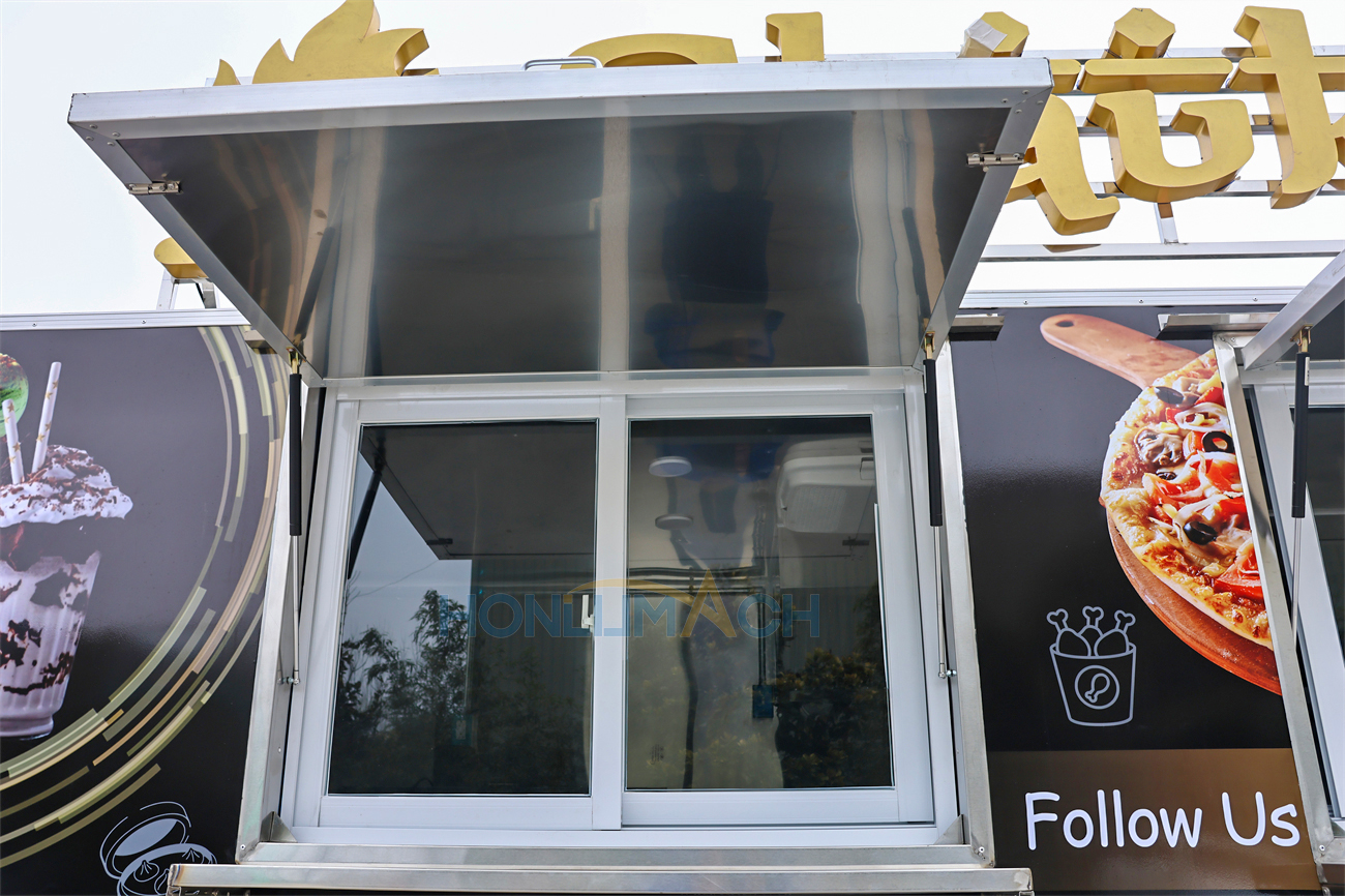 In the front of the food trailer, we have made two big servie windows according to the customer’s requirements. That will be very convenient for guests who come to dine to order and pick up their meals. On the top of each window, we have installed a retractable awning. The awning will protect people from sunshine and rain, which is a thoughtful design. Next, let’s see the back view of this large food trailer.