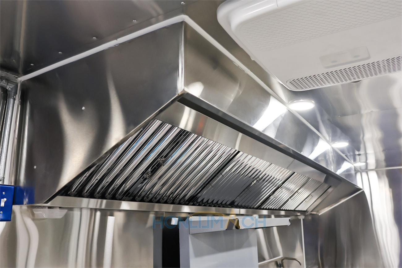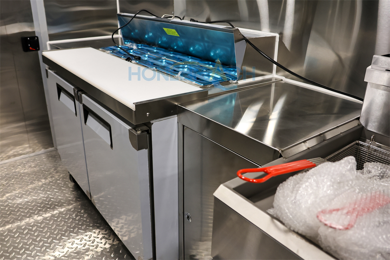 According to the customer’s requirements, we have equipped the 5.7m large catering trailer with kitchen equipment. In the following are some of the inner details of this trailer. There is a range hood, sinks, an air conditioner, a salad bar refrigerator, a gas stove, a gas fryer, a griddle, a grill, a storage cabinet, and a workbench, etc. Our customer will add some other equipment he needs after receiving the trailer.