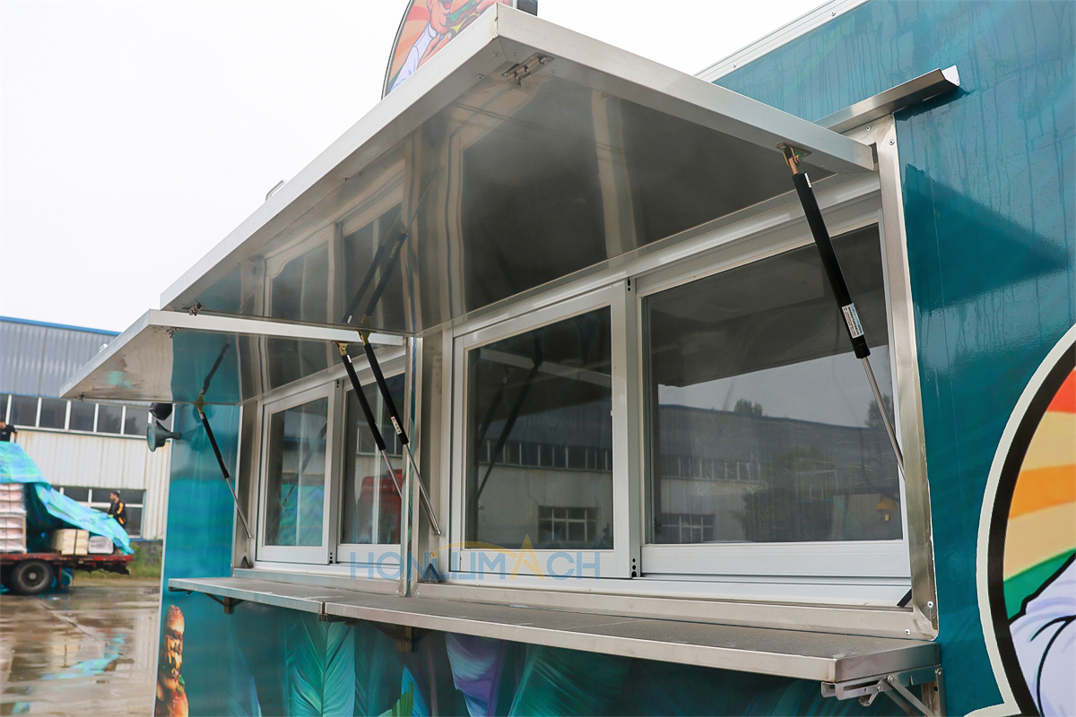 In the front of the food trailer, we have made two big servie windows according to the customer’s requirements. That will be very convenient for guests who come to dine to order and pick up their meals. On the top of each window, we have installed a retractable awning. The awning will protect people from sunshine and rain, which is a thoughtful design. Next, let’s see the back view of this large food trailer.