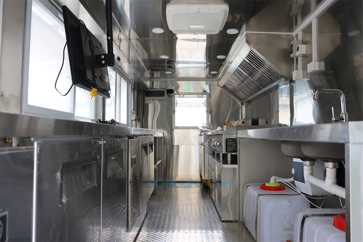 | Standard Configuration | 1) 201 Stainless steel interior wall, 2) 201 stainless steel workbench, 3) 304 Stainless steel sinks *2 4) hot & cold tap *1 5) 20L water basket *2 6) tire*4 7) jack*4 8) big service window * 1 9) socket*6 10) power switch More, customized |