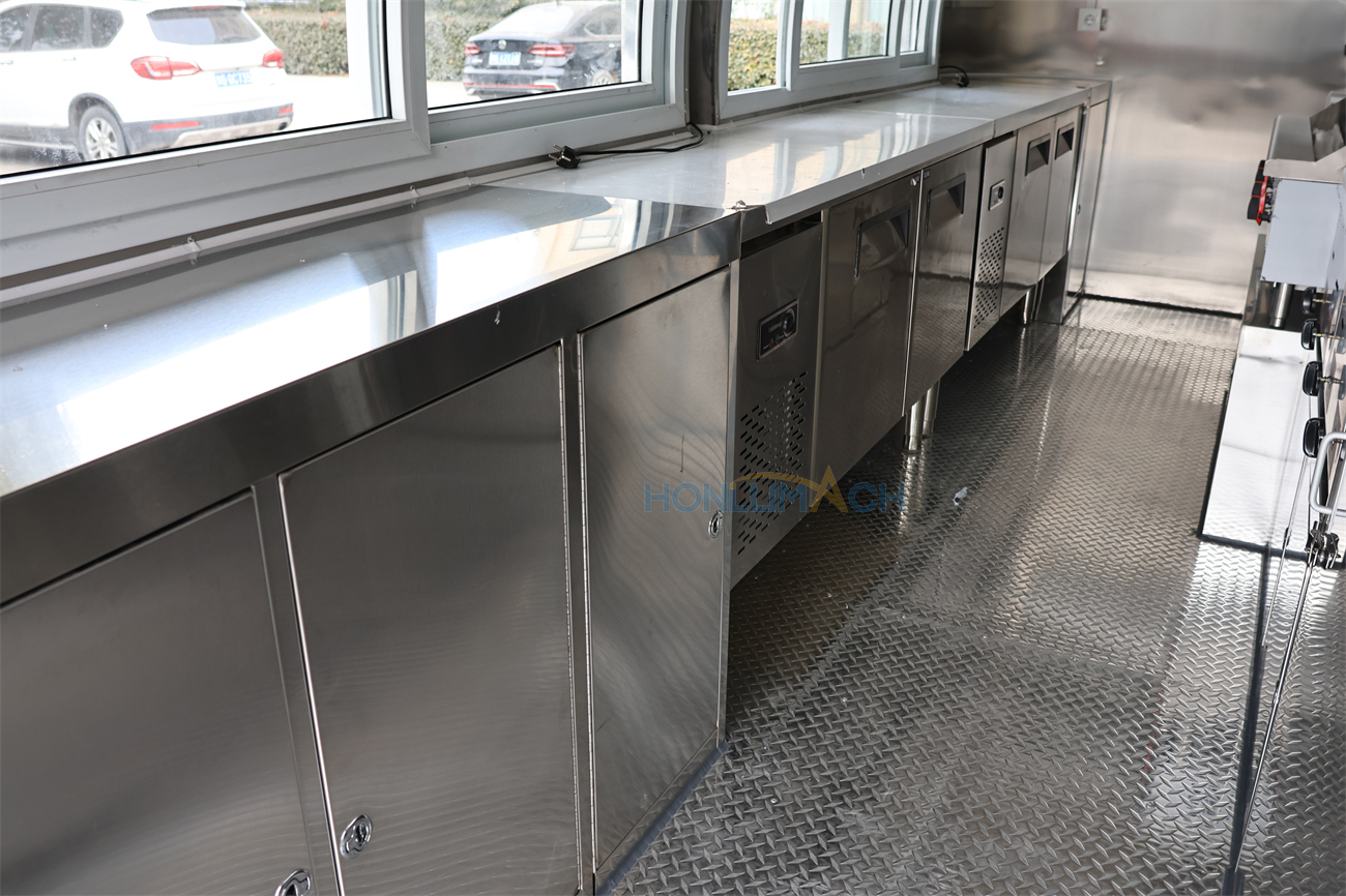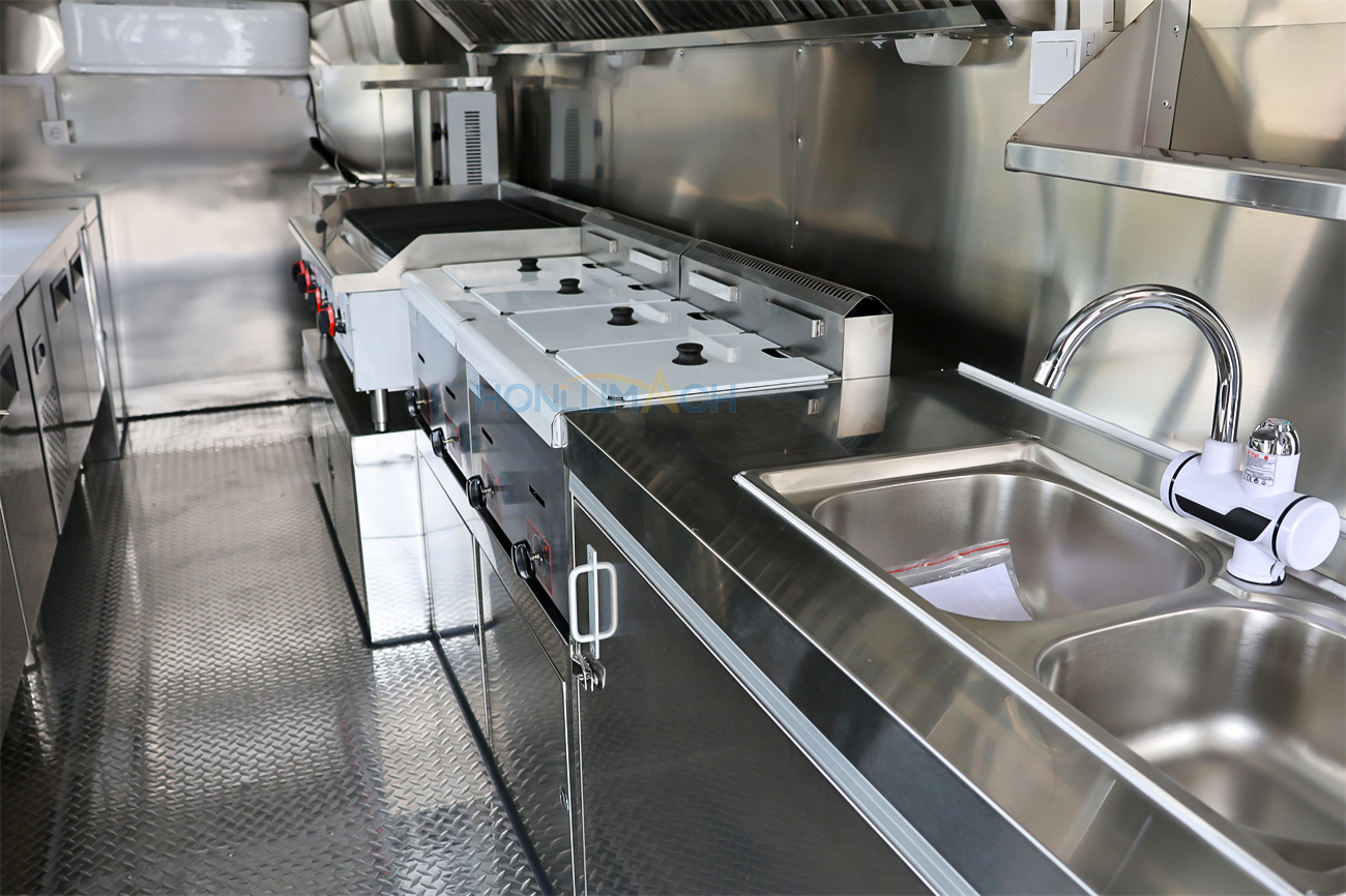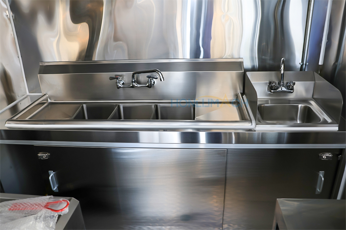 | Standard Configuration | 1) 201 Stainless steel interior wall, 2) 201 stainless steel workbench, 3) 304 Stainless steel sinks *2 4) hot & cold tap *1 5) 20L water basket *2 6) tire*4 7) jack*4 8) big service window * 1 9) socket*6 10) power switch More, customized |