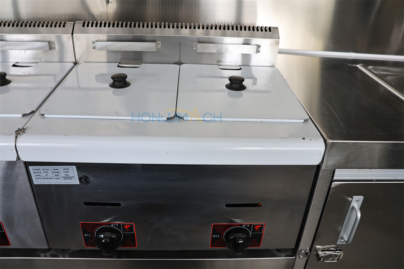 According to the customer’s requirements, we have equipped the 5.5m large catering trailer with kitchen equipment. In the following are some of the inner details of this trailer. There is a range hood, sinks, an air conditioner, a salad bar refrigerator, a gas stove, a gas fryer, a griddle, a grill, a storage cabinet, and a workbench, etc. Our customer will add some other equipment he needs after receiving the trailer.