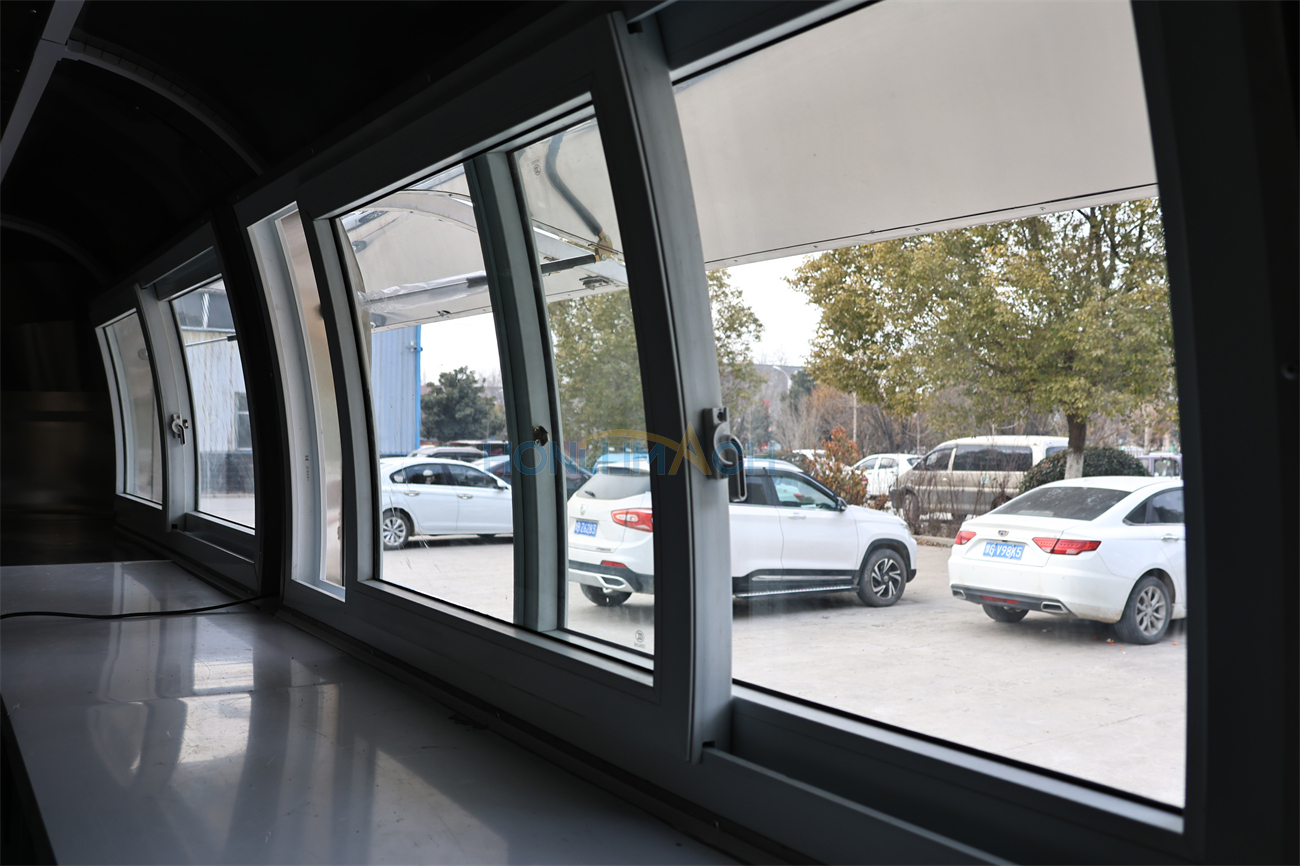 In the front of the food trailer, we have made two big servie windows according to the customer’s requirements. That will be very convenient for guests who come to dine to order and pick up their meals. On the top of each window, we have installed a retractable awning. The awning will protect people from sunshine and rain, which is a thoughtful design. Next, let’s see the back view of this large food trailer.