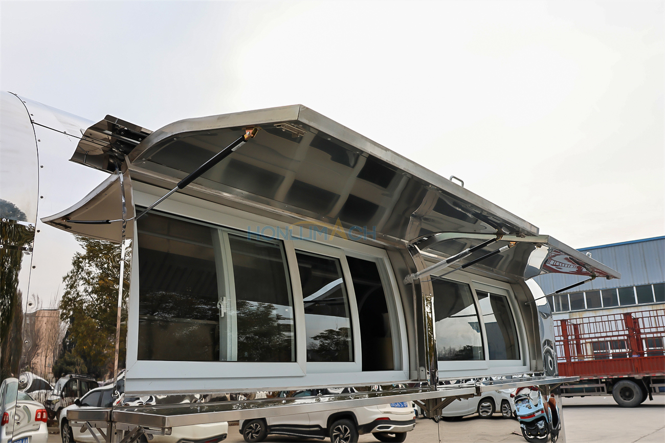 This is a stainless steel food cart from Romania, approximately 18 feet long. The entire cart’s appearance, color, pattern, and structure are customized to the client’s requirements. A prominent illuminated sign on the roof can also be specified, ensuring clear visibility even in the dark for easy customer identification.