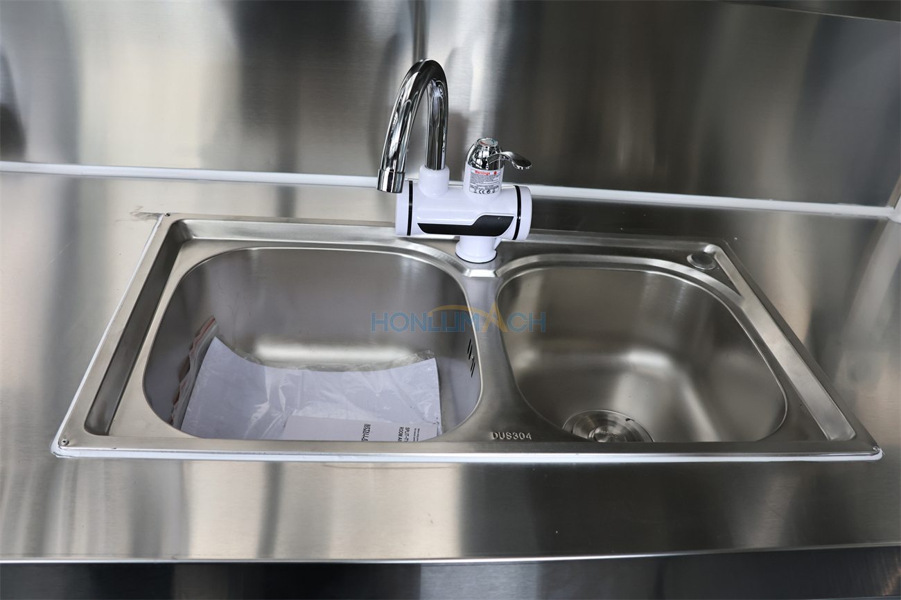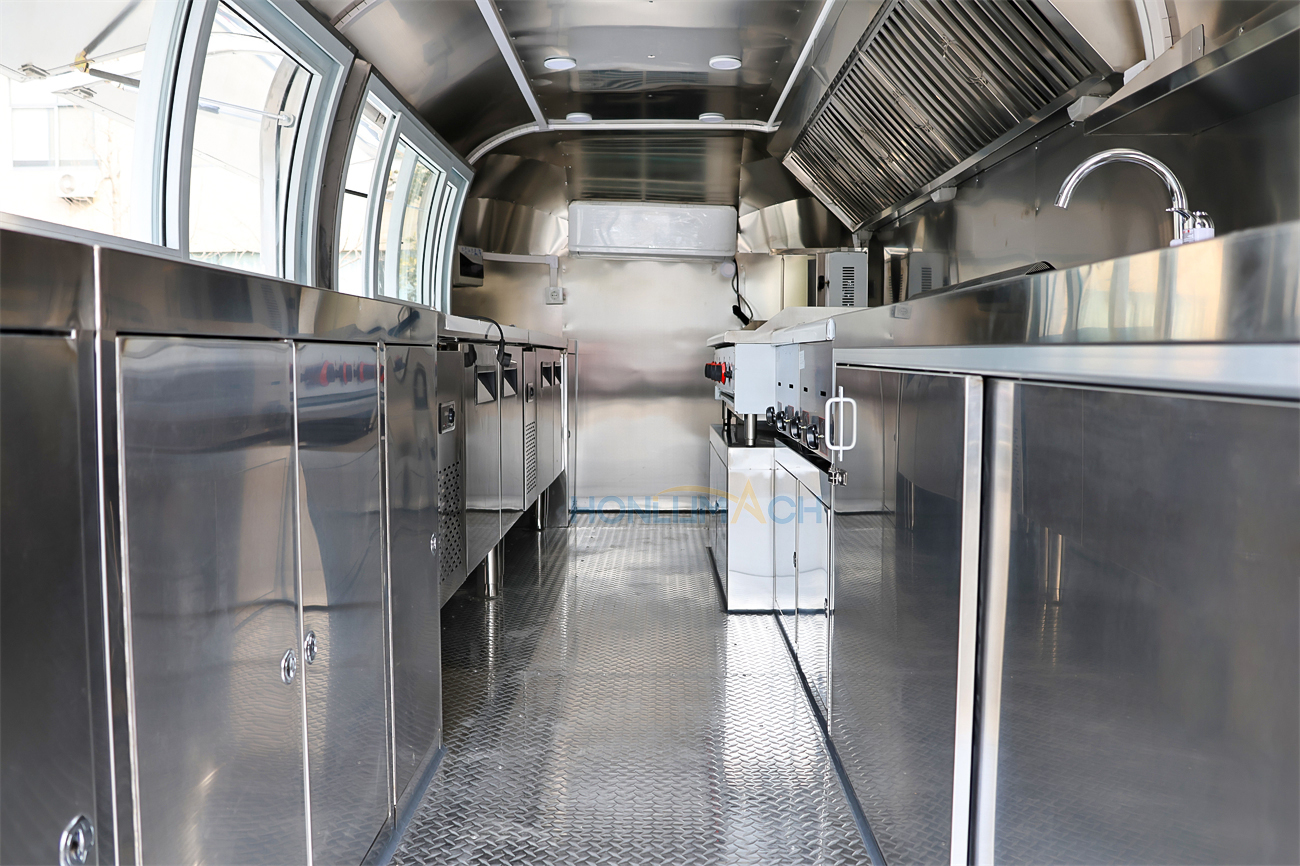 This is a stainless steel food cart from Germany, approximately 18 feet (5.5 meters) long. The entire cart’s appearance, dimensions, and structure are customized to the client’s requirements. A prominent illuminated sign on the roof can also be customized to ensure clear visibility even in the dark, making it easy for customers to find.