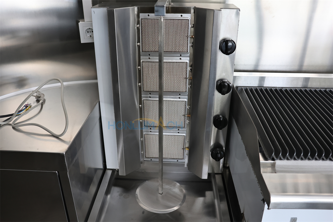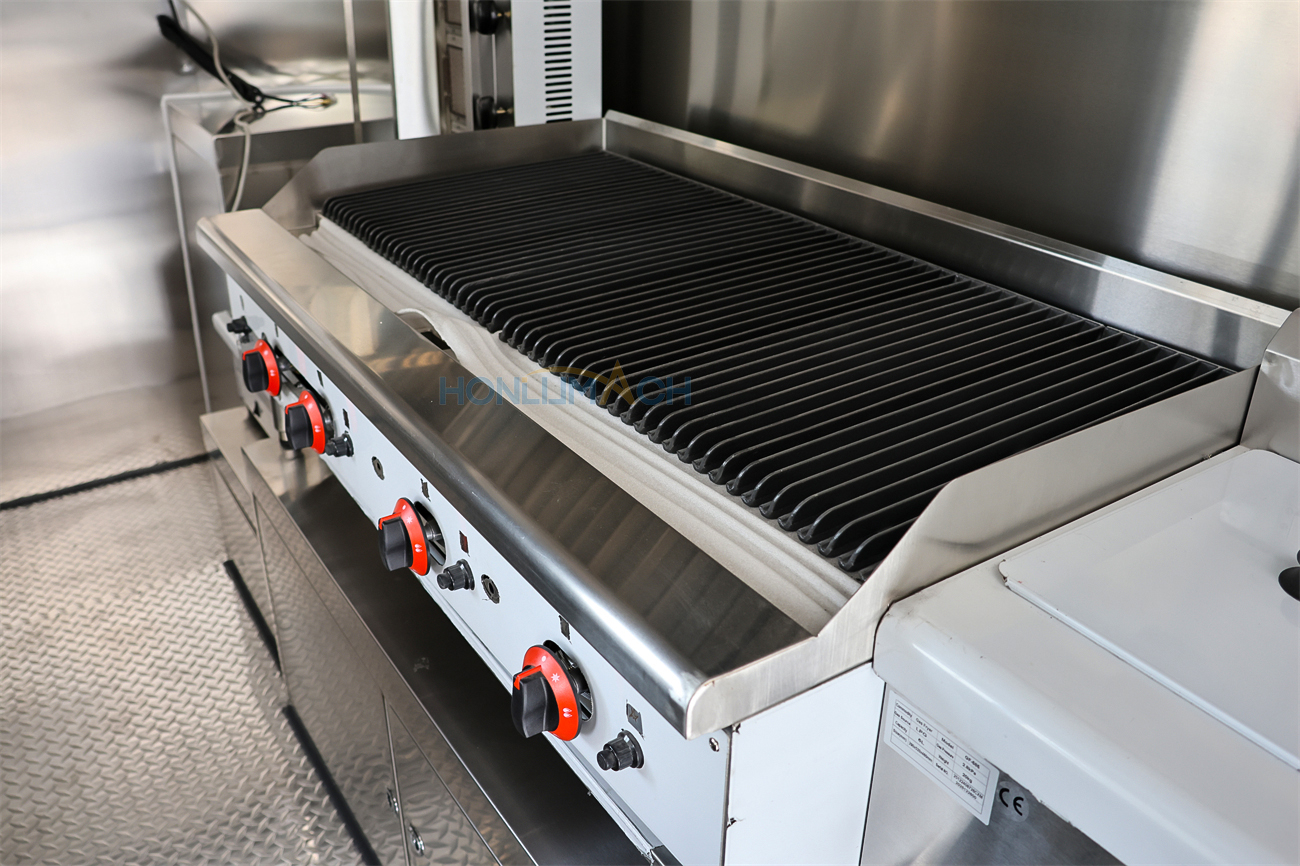 Učinkovita oprema za kuhanje: Za hitro pripravo hrane je tovornjak s polno kuhinjo opremljen z več napravami za kuhanje z veliko zmogljivostjo.